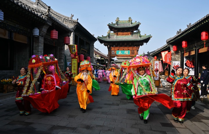 2022年1月25日,当日是农历小年,2022锦绣太原中国年·凤舞龙城花灯会在太原古县城开幕,这是演员在进行民俗表演