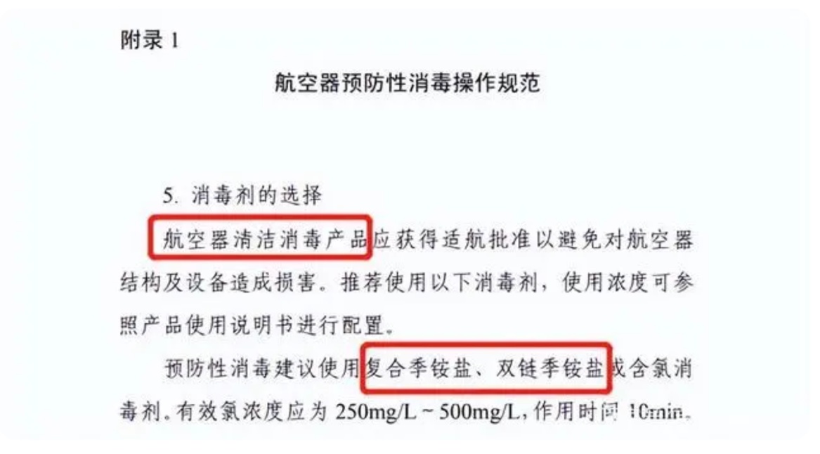 目前市面上的常见消毒剂中,仅季铵盐类消毒剂因具有不易燃、不易爆、无腐蚀性的特点,可随身携带登机。根据民航局修订发布的《运输航空公司、机场疫情防控技术指南(第八版)》,季铵盐类消毒剂可用于航空器预防性清洁消毒,其具备杀菌率高、稳定性好的特点。