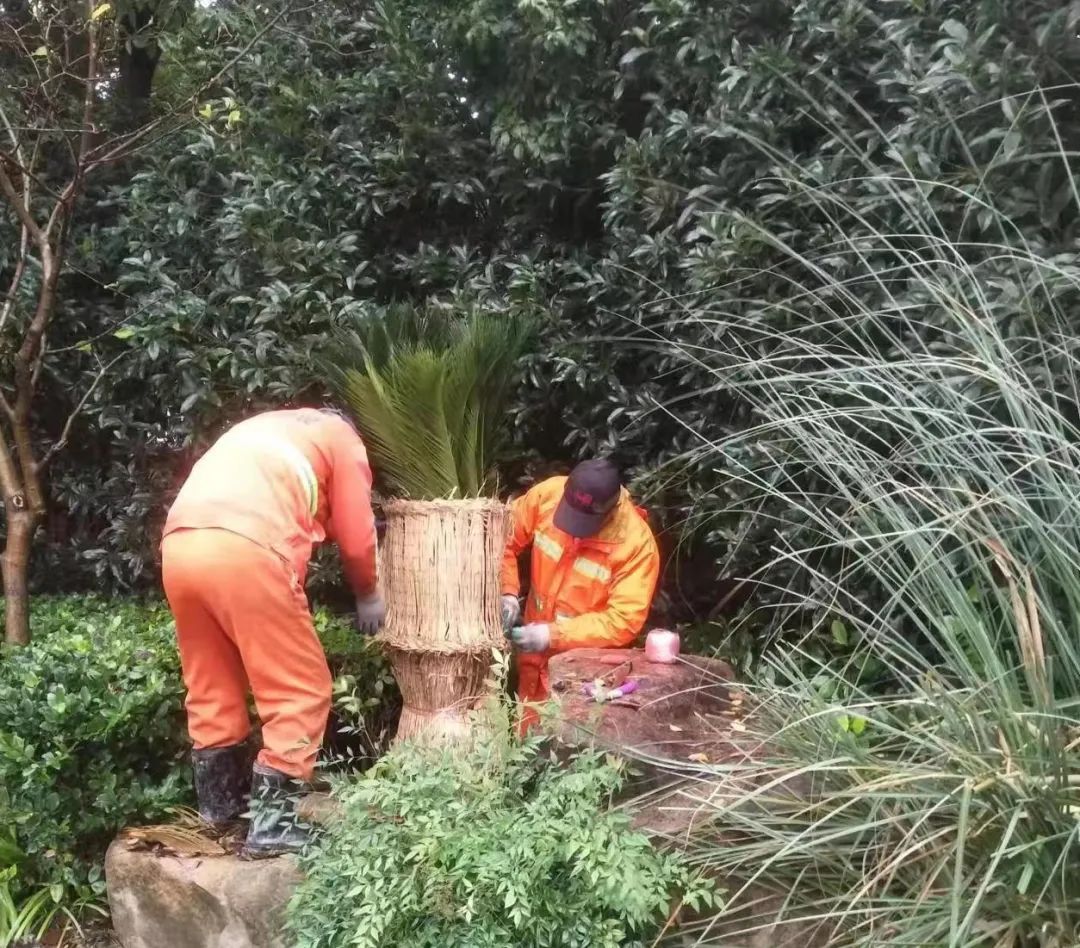应对本次寒潮,要求一线作业单位严格落实应对冰冻灾害天气人员和物资保障工作,储备黄沙、草袋等应急物资,确保能第一时间投入使用;其次做好绿地内易受冻花卉苗木的防寒保暖工作。