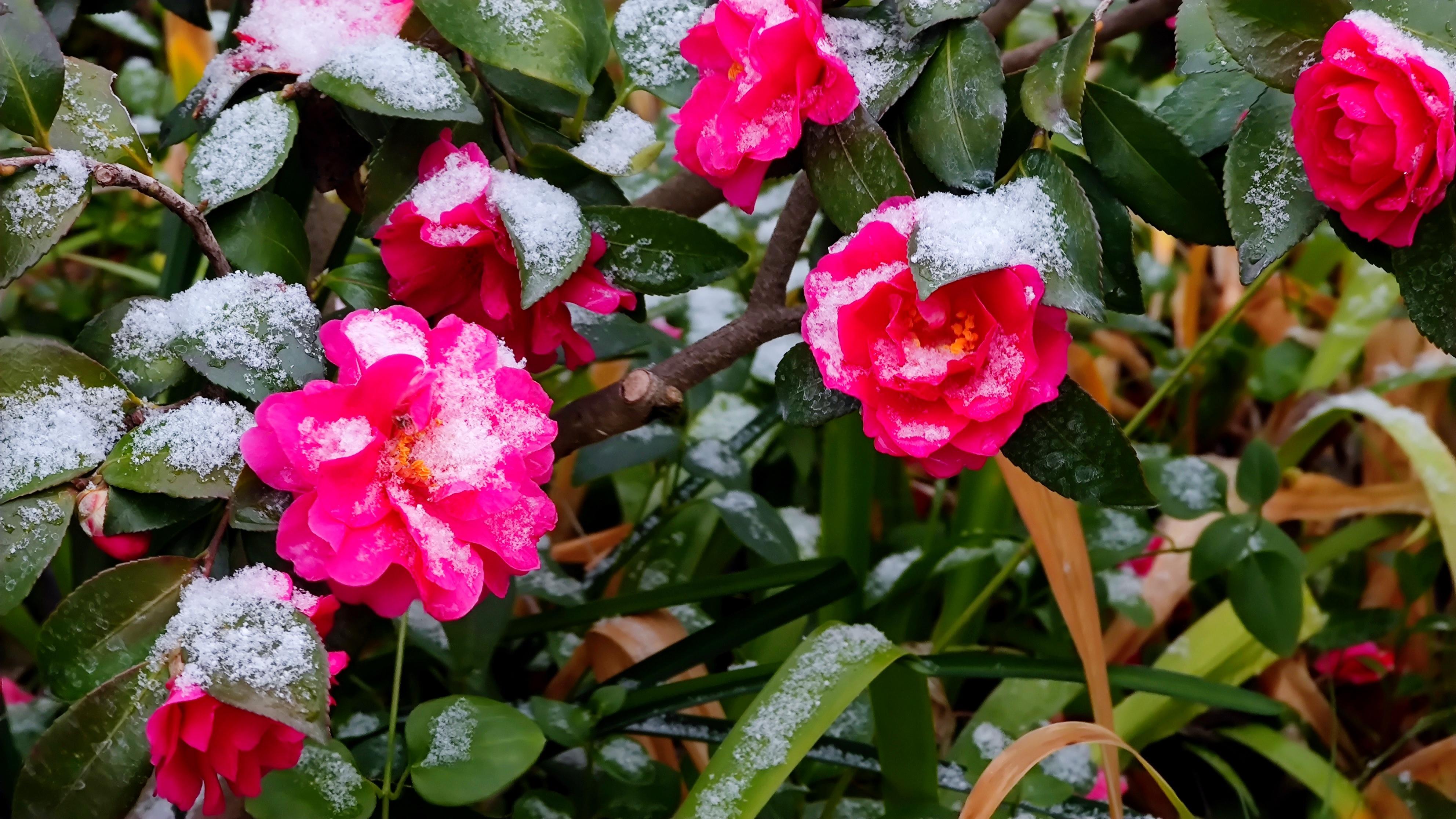 相比蜡梅,形似茶花的茶梅要长得低矮很多。在园内积雪的映衬下,这一朵朵耀眼的红色,似乎能让人忘却寒冷。据介绍,茶梅冬开春谢,而且花瓣会飘落但花色不褪,到了春天百花盛开,茶梅花瓣落在土壤上铺成花毯,昔日的落红便化成了“护花的春泥”。