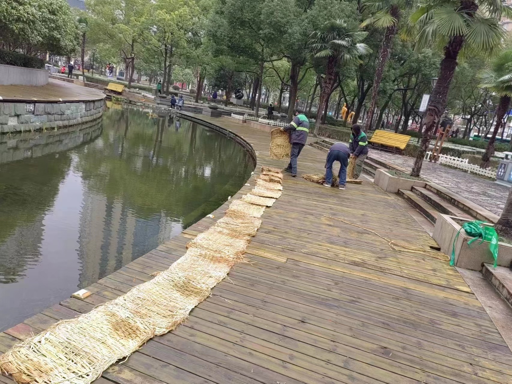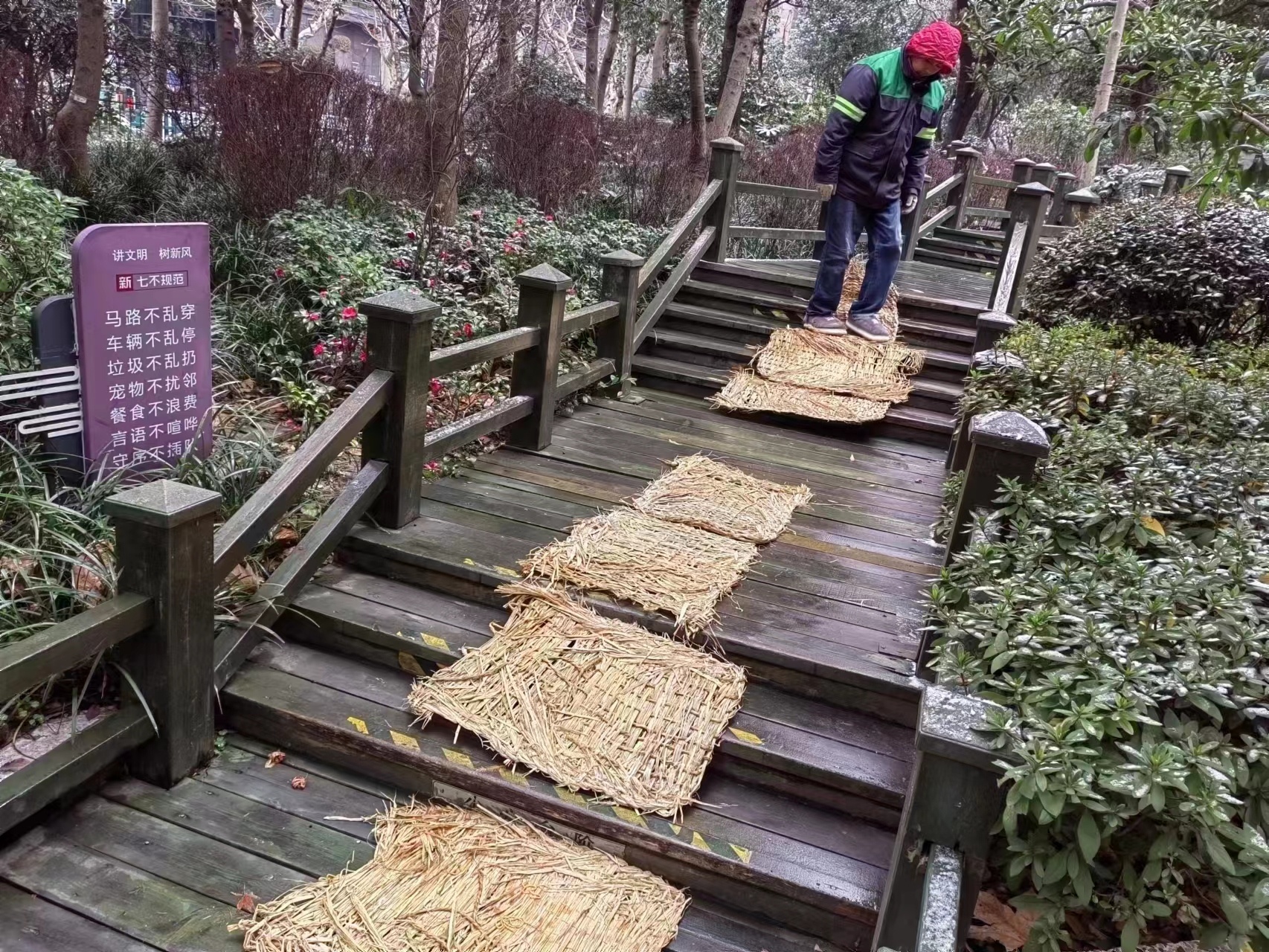 在容易积水处铺设防滑垫和草包