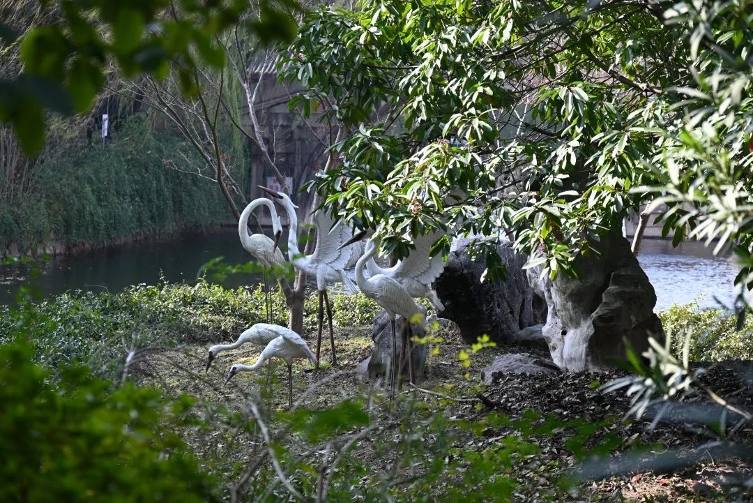 在古华园,位于南塘第一桥东侧有一处悬水景观,几个“仙鹤”就隐匿其中,由于距离岸边较远,远远望去,白鹤或站立嘶鸣,或低头觅食,栩栩如生。
