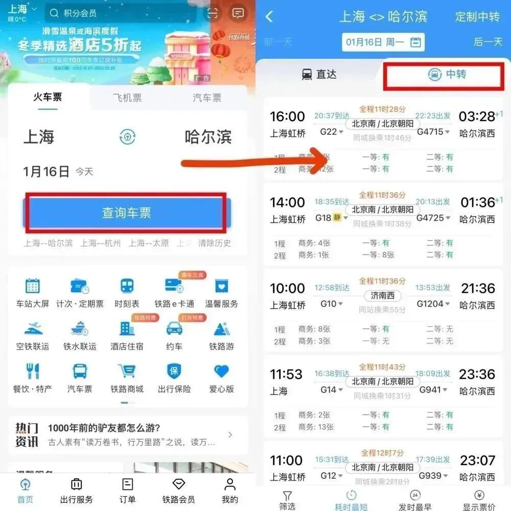 铁路部门建议,如果部分旅客没有买到直达目的地的车票,可以通过购买联程车票的方式出行。如:从上海出发想去哈尔滨,就可以先购买上海至北京的车票,然后在同城换乘北京至哈尔滨的列车;如果想从上海去西安,也可以从徐州或郑州换乘,在同城换乘回家的列车。