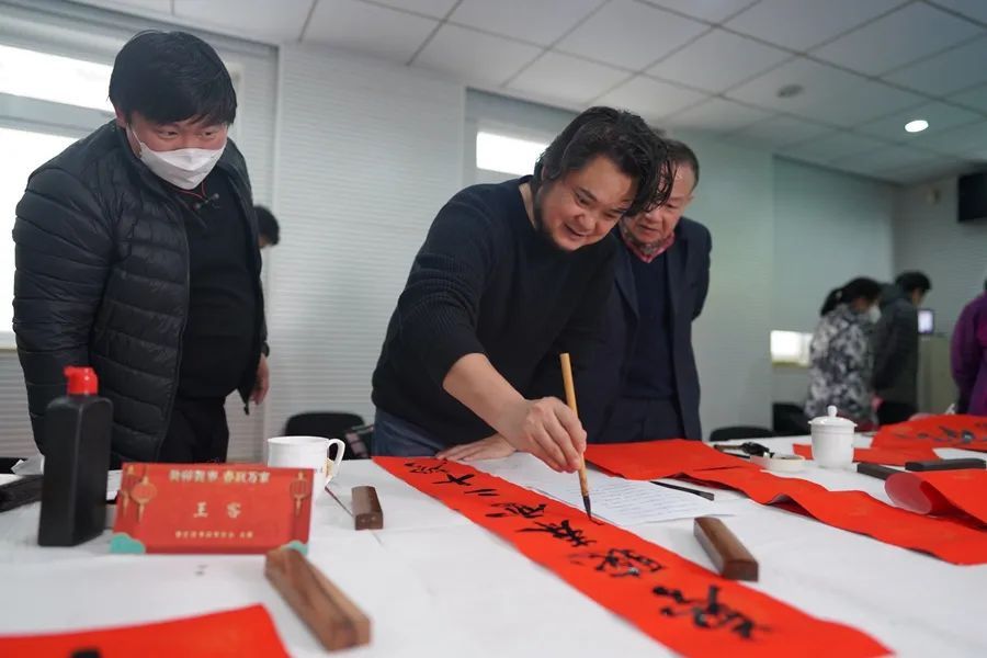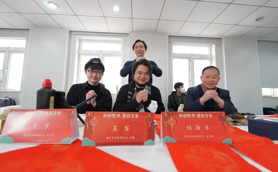 徐汇区书法家协会主席王客、副主席相海勇、秘书长乔宇3位书法家来到社区党群服务中心,为湖南路街道社区居民写春联、送祝福。