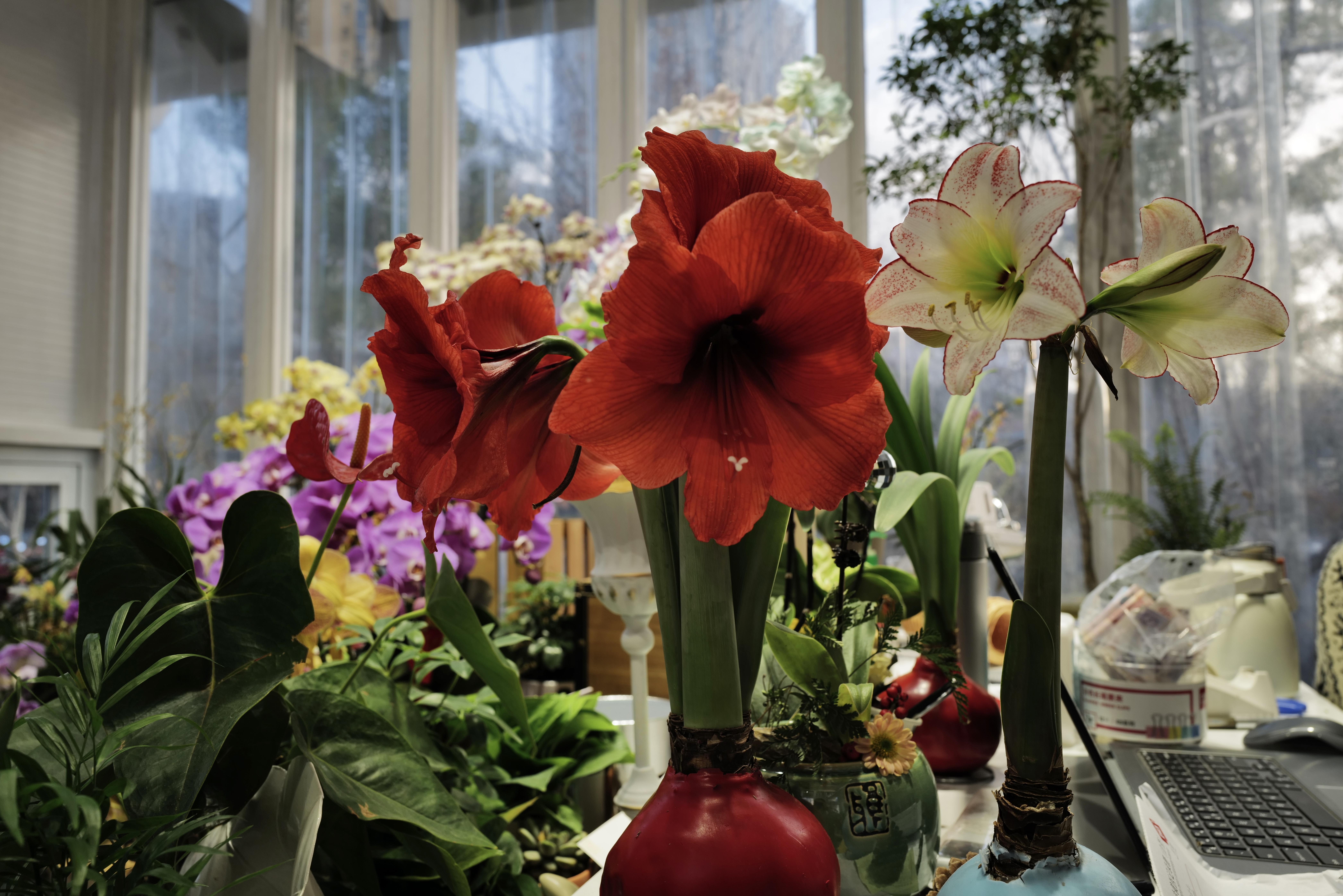 它的颜值高级又出挑,颜色通常有红、粉、白、黄、条纹等。红色的朱顶红在临近年底是最畅销的颜色,只要一支就足够耀眼艳压群芳。出场自带女王的架势,大方又霸气。粉色的温温柔柔,文静却不扭捏。白色的则带着一股仙气,完全不输给夏日池边的荷花。