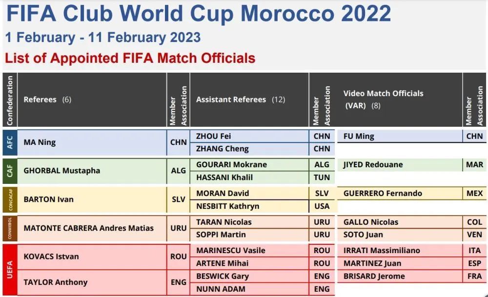 国际足联1月15日在官网公布2022摩洛哥世俱杯执法裁判员名单,国际级裁判员马宁、傅明和国际级助理裁判员周飞、张铖入选。这将是来自中国的裁判组首次执法该项国际足联顶级赛事。