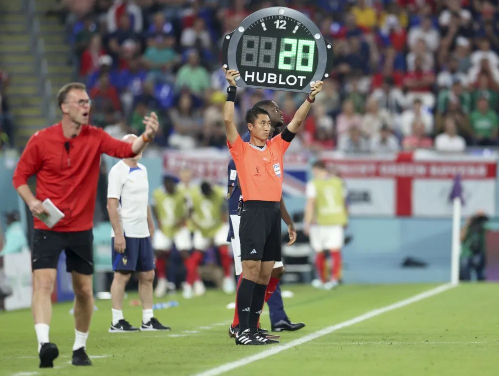 2022年11月26日,第四官员马宁(右)在卡塔尔世界杯法国队对丹麦队的比赛中举起换人牌