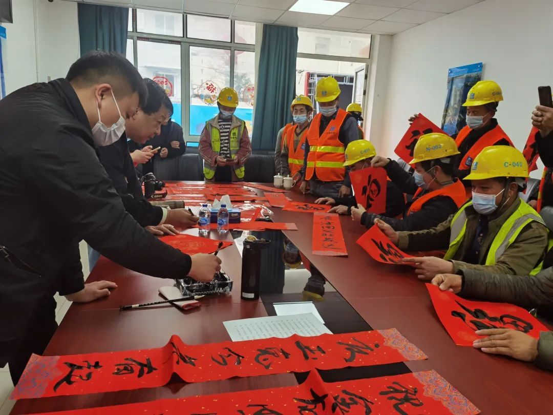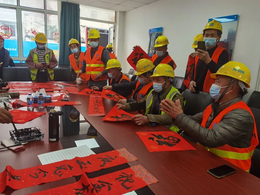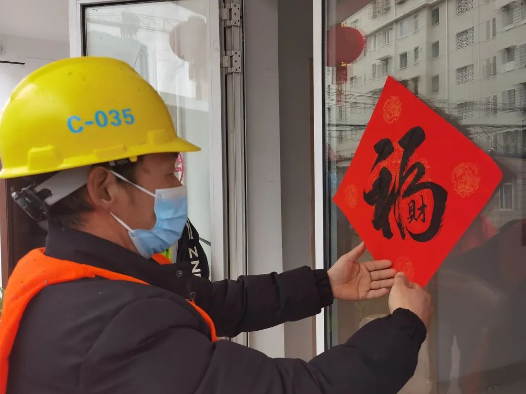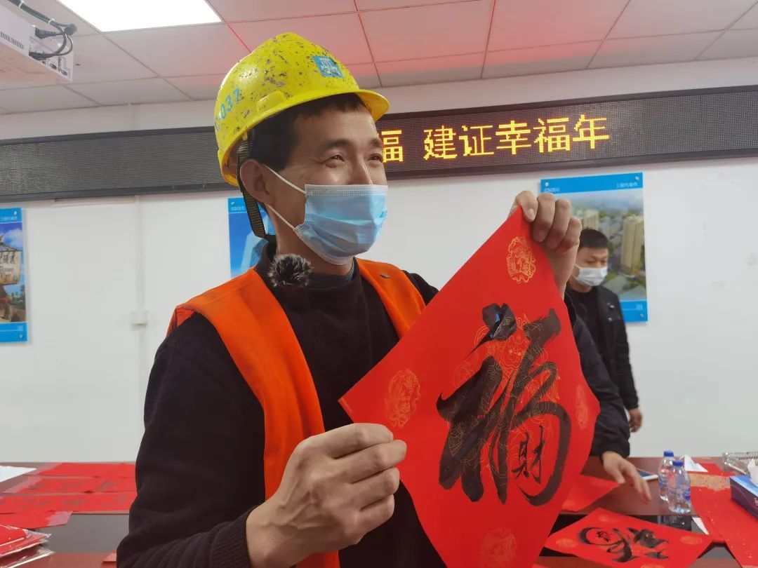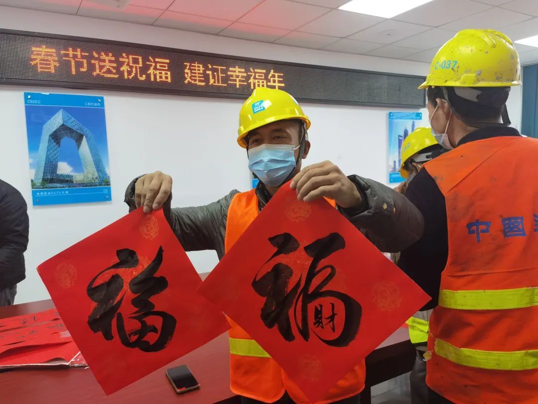 除了带回家的“年味”之外,工友们也在项目工地内,张贴起了春联、“福”字、窗花,现场洋溢着喜庆的氛围。活动中,项目部对坚守岗位的一线建设者表示感谢,并为他们送上新春礼包等春节慰问礼品。