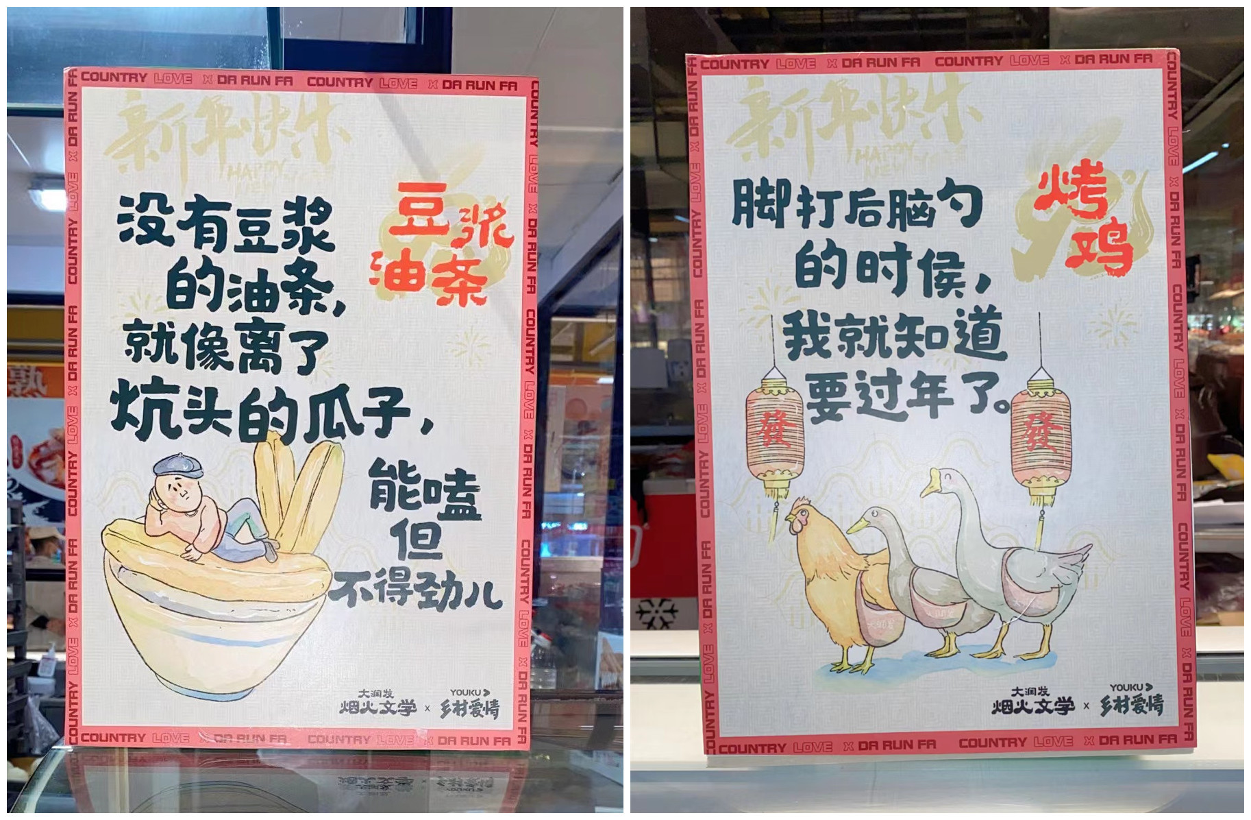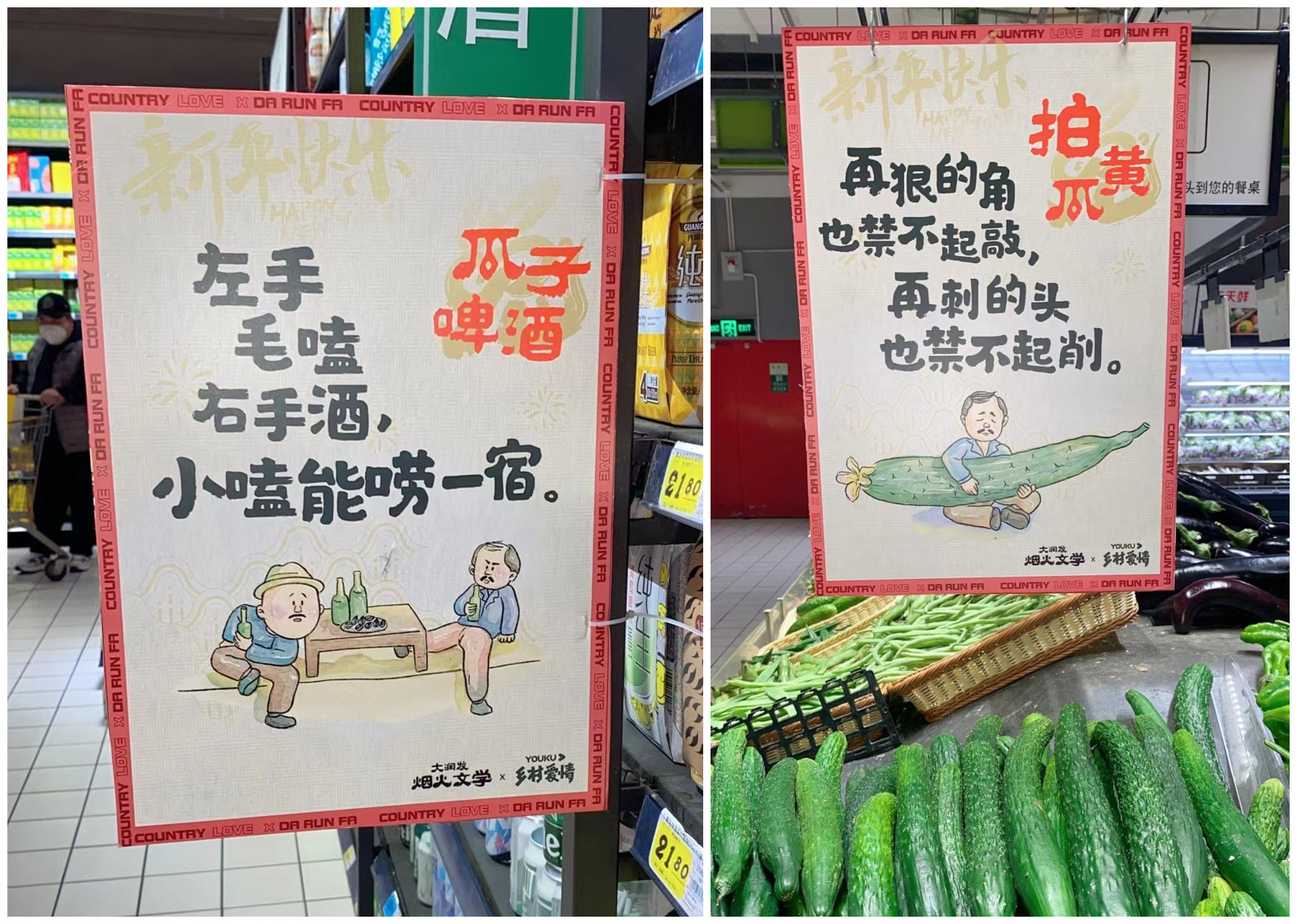 烤鸡货架旁写着“脚打后脑勺的时候,我就知道要过年了”;豆浆油条旁边写着“没有豆浆的油条,就像离了炕头的瓜子,能嗑,但不得劲儿”;瓜子啤酒旁边摆着“左手毛嗑(瓜子)右手酒,小嗑能唠一整宿”;前阵子的超市“顶流”黄桃罐头配的文案是“唠进人心的才是嗑,甜进人心的才叫哥”。海报上的配图上,还有《乡村爱情》里主人公刘能、谢广坤、宋晓峰等卡通形象,活灵活现。