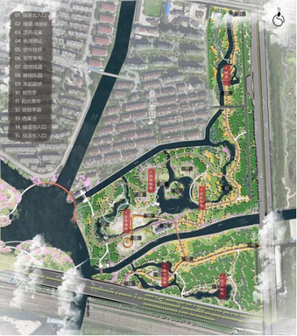 春光公园依托外环林带近30年自然生长所形成的优渥生态本底,在设计理念上,充分利用新槎浦、中槎浦、凌家浜、新泾河、金昌河五条河道交汇的特色场地肌理,以及桃浦地区自古以桃闻名的历史人文记忆,聚焦环上慢行贯通、生态系统修复、公共服务能力提升、绿色创新技术应用等,在尽量不影响森林覆盖率的前提下,巧借现状山水地形,巧用林窗林下空间,梳理构建“一湖一岛·一环十景”的新空间格局,通过“林到公园”的更新蝶变,打造集生态修复、人文艺术、生活休闲等功能为一体的“环上桃源”,百姓美好生活的承载地。