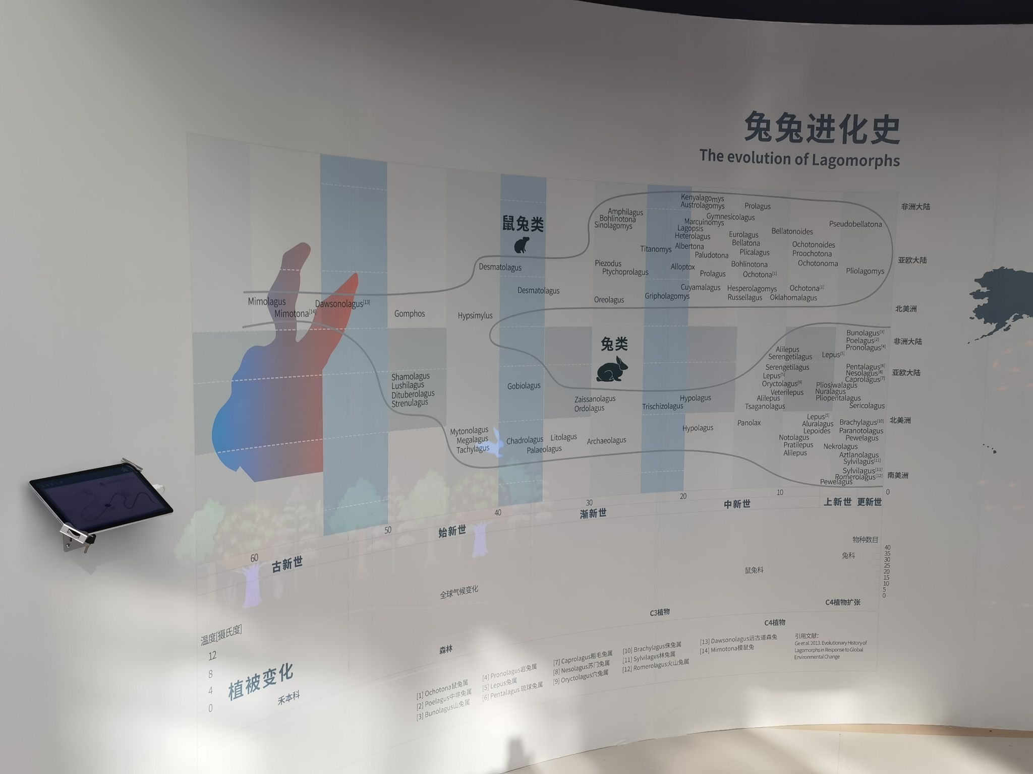 “兔玲珑”展区通过多媒体互动展现了全世界兔形目的分类、分布、进化历史。兔有着6000多万年的家族史,在热带草原、荒漠、高原、极地等,都能看到它们的身影,然而现在环境和气候的改变让部分兔面临濒危的困境,启示观众保护地球生物多样性的重要性。