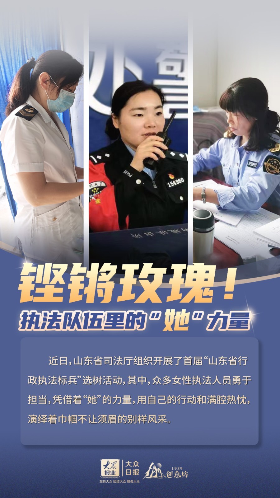近日,山东省司法厅组织开展了首届“山东省行政执法标兵”选树活动。其中,众多女性执法人员勇于担当,凭借着“她”的力量,展现巾帼英姿。