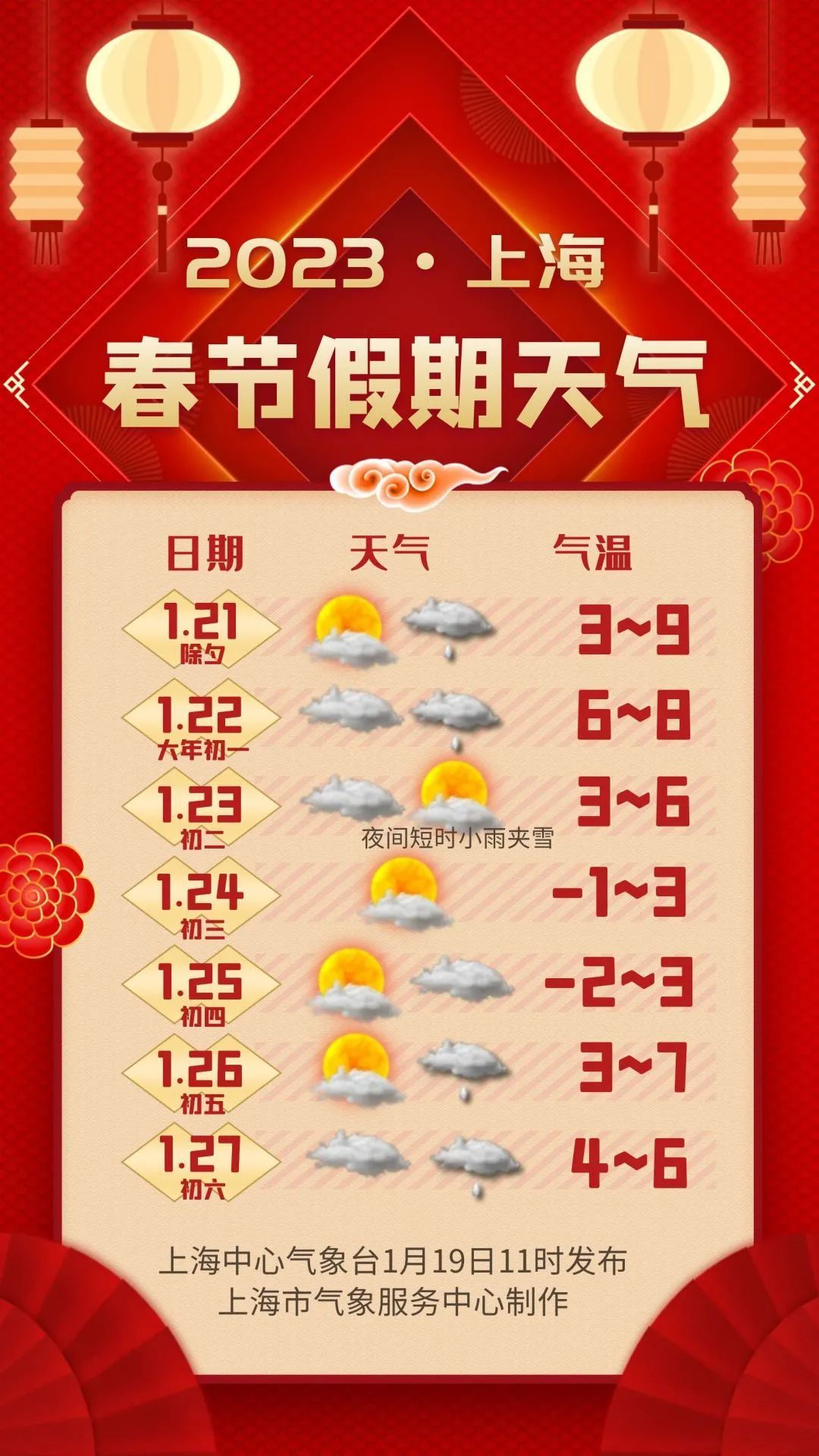 春节假日以过程性天气为主,两头雨,中间多云。降水过程主要出现在1月22日前后和27日,其中22日过程雨量可达小到中雨,23日夜间局部有小雨夹雪;23-24日北方强冷空气南下,本市有大风降温过程。