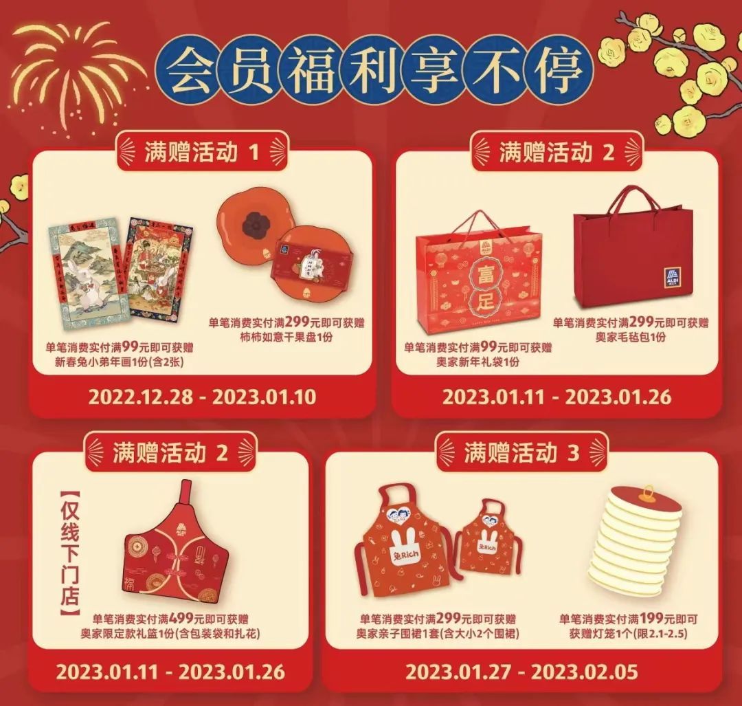 ALDI奥乐齐为会员准备了多重惊喜满赠福利。1月11日—1月26日,单笔消费实付满99元即可获赠奥家新年礼袋1份。单笔消费实付满299元即可获赠奥家毛毡包1份。于线下门店单笔消费满499元即可获赠奥加限定礼篮1份(包含装袋和扎花)。