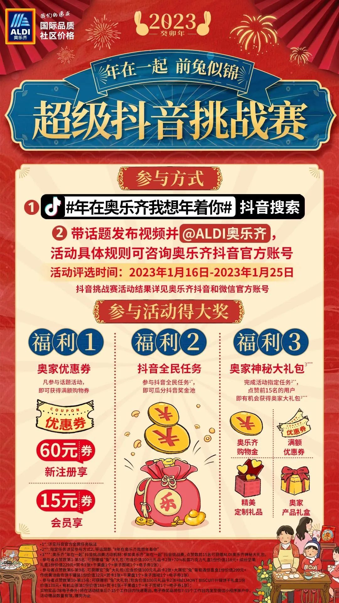 以#年在奥乐齐我想年着你 为话题,发布视频并@ALDI奥乐齐抖音官方账号,即可获得奥家满额优惠券,并瓜分抖音奖励金,更有神秘大礼包等惊喜好礼!