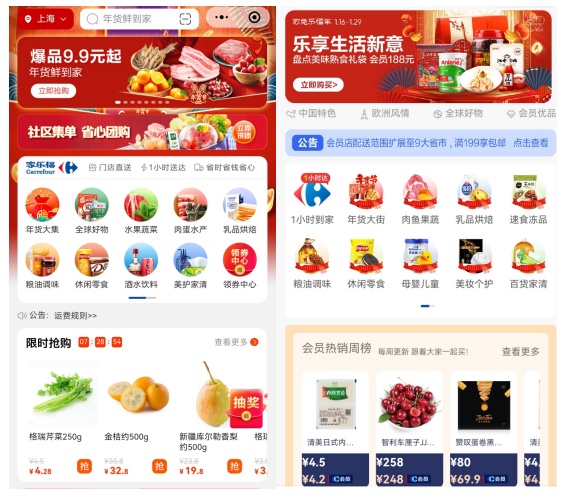 除了持续整月的促销福利,今年年货节,更是出台了更多“个性化”的服务措施。“除了线上线下不打烊之外,今年我们承诺不增加运费费用。”家乐福相关负责人表示:“今年年货节线上到家业务覆盖范围,3公里内1小时达;5公里内1.5小时达;家乐福会员店配送范围扩至9大省市,即上海、江苏、浙江、安徽、北京、广东、河南、山东、江西等地,购物满199元即可享受包邮到家。”