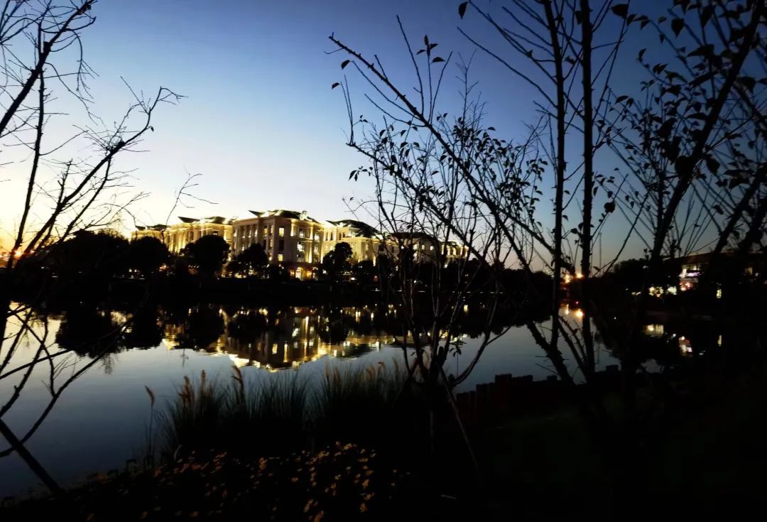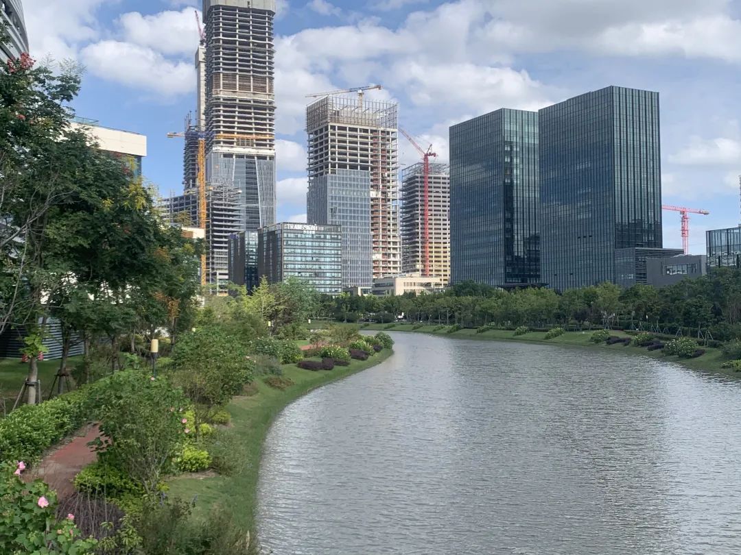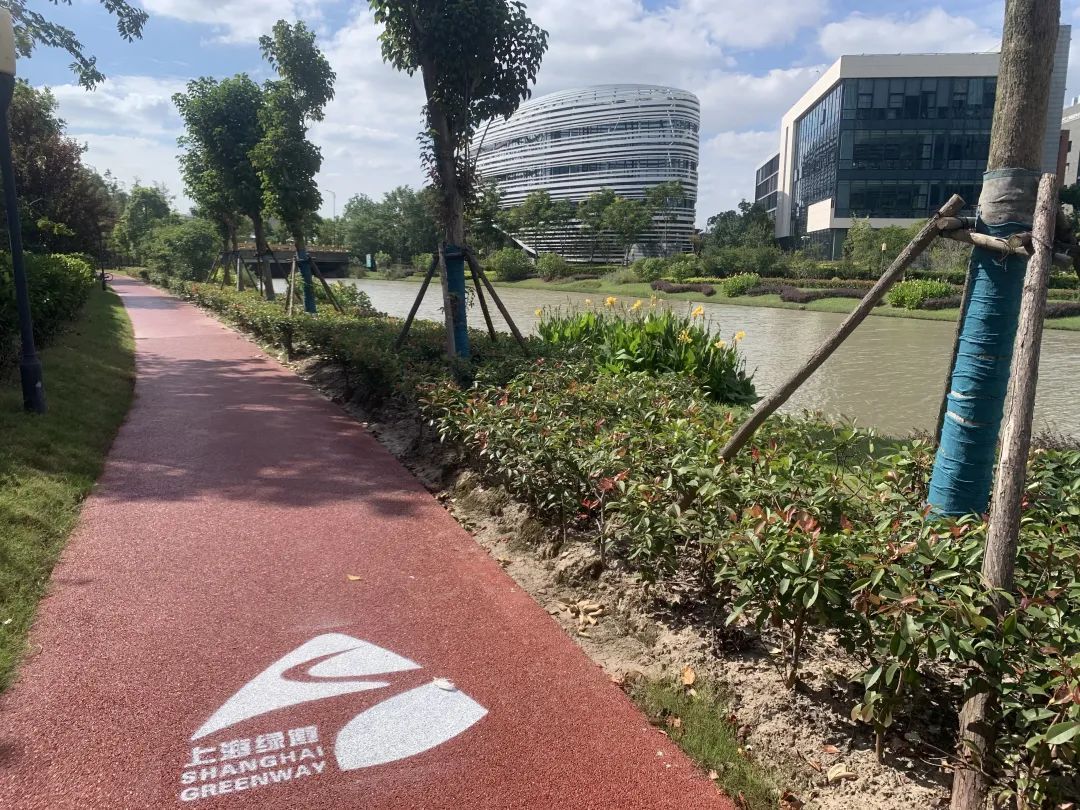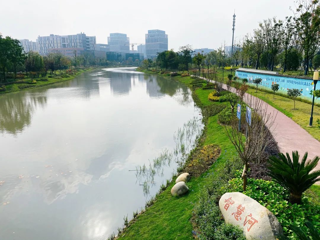 智慧河绿化品种多样、色彩丰富,与周边人工智能岛相得益彰,走在河道旁的健身步道上,能够亲切感受到科技、自然、生态的和谐统一。