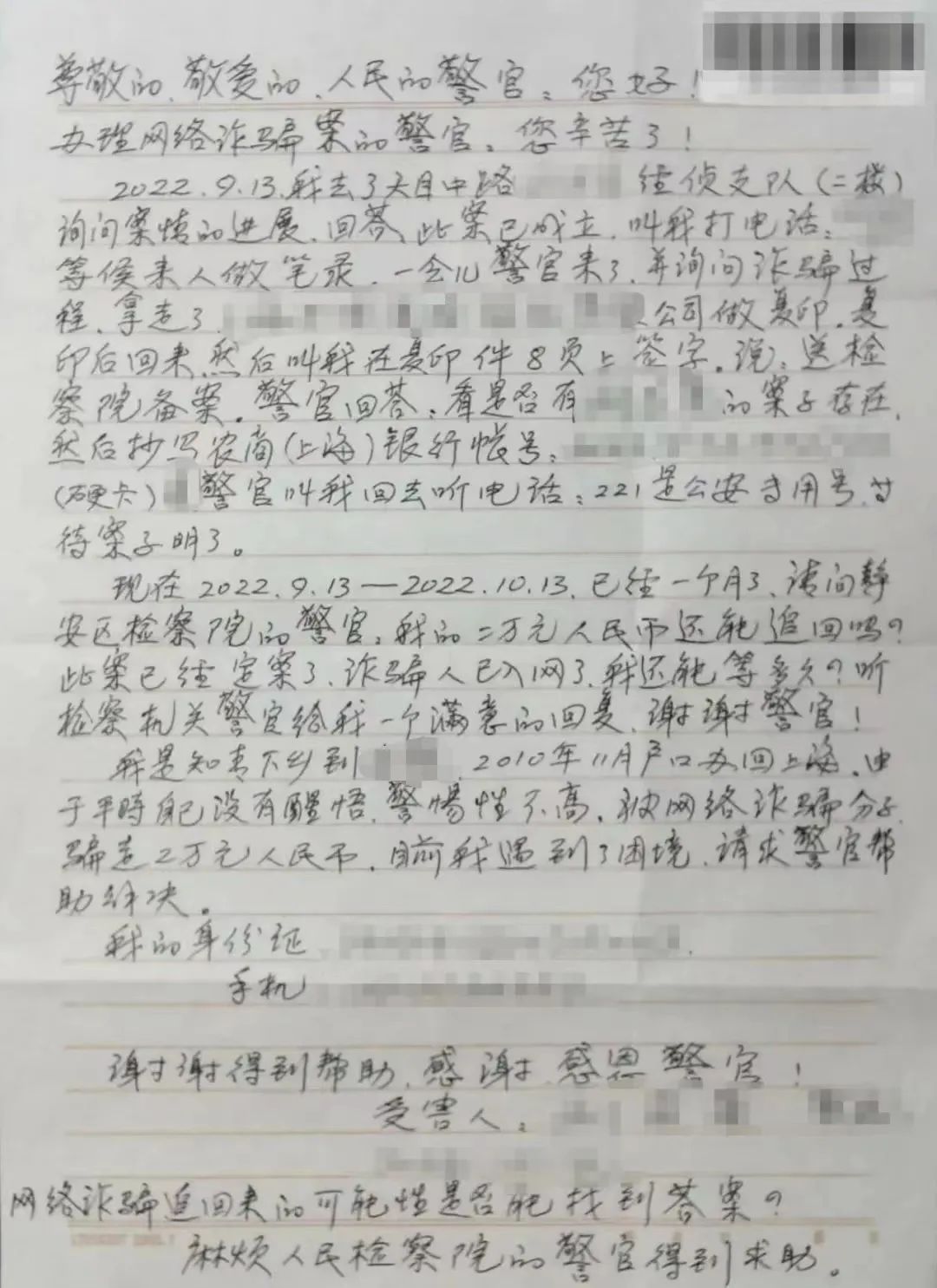2022年11月,检察官张杰收到一封手写求助信,来信的是年逾古稀的李老伯,内容有些语焉不详,大意是李老伯被网络诈骗2万元,已报案,公安机关告知其相关材料会给到检察机关。信中,李老伯表示自己是知青下乡后回沪的,平时警惕性不高,所以导致被骗,想问问检察官,被骗的钱款能否追回,并表示生活遇到困境,希望得到检察机关的帮助。