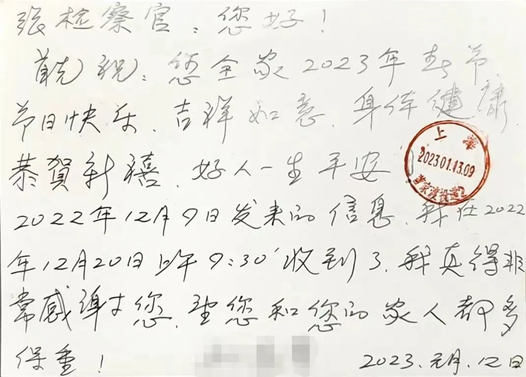“张检察官,祝您全家2023年春节节日快乐,吉祥如意,身体健康。真的非常感谢您,望您和家人都多保重。”春节前夕,上海市静安区检察院检察官张杰收到了一张手写的明信片,寄件人是他办理的一起司法救助案件的当事人李老伯。
