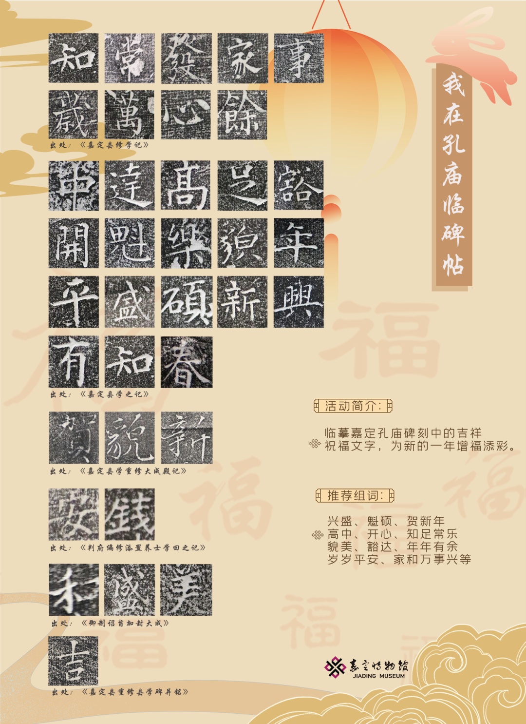 为唤醒市民对传统民俗文化的记忆,春节期间,嘉定孔庙将推出“孔庙临碑 瑞兽送福”活动,从大年初一到年初五,在嘉定孔庙内集齐6个神兽印章,可以领取嘉博的文创周边产品,还可以现场参与“我在孔庙临碑刻”活动,近距离体验孔庙的独特魅力。