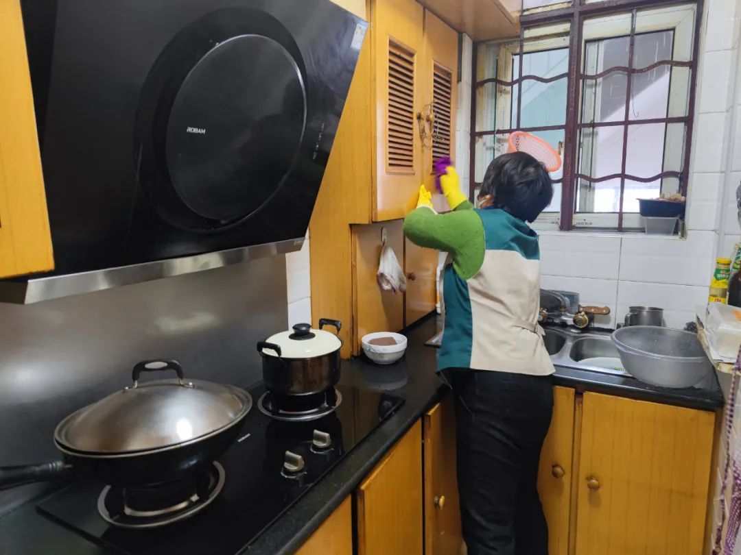 傅老伯已年近九旬,耳朵失聪,儿女不常在身边,老伴和他的腿脚都不太方便,对繁重的家务活心有余而力不足。1月20日上午,嘉定镇街道综合为老服务中心为老人安排了免费的家政服务。助老员何雪芬经过3个多小时的紧张劳动后,老人家里的地板干净整洁,厨房油污清理干净,屋里屋外收拾得井井有条。