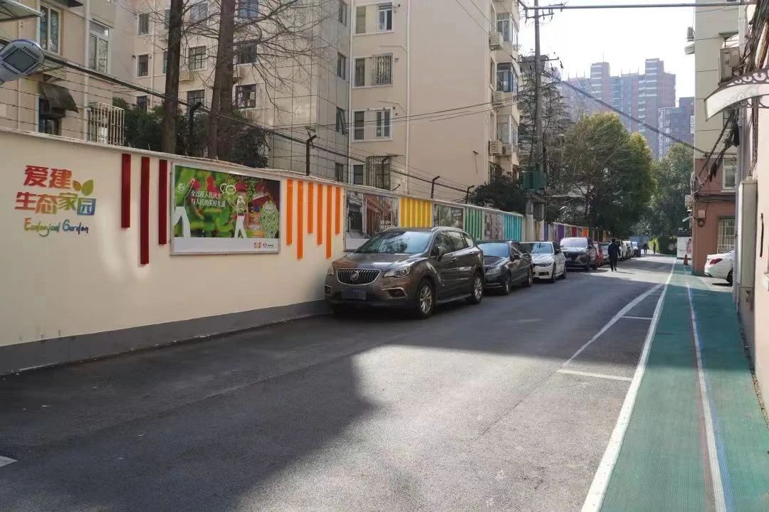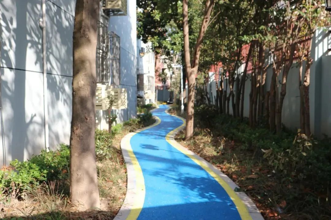 离开居委会,记者跟着徐秀,沿着2022年刚刚建设完成的彩虹步道,走进了小区。一边走,徐秀一边介绍道,这条彩虹步道连通了爱建、中园、中华别墅3个小区,一方面希望引导小区的车主有序停车,另一方面也让小区的老人更方便地在弄堂里行走。