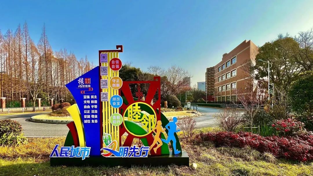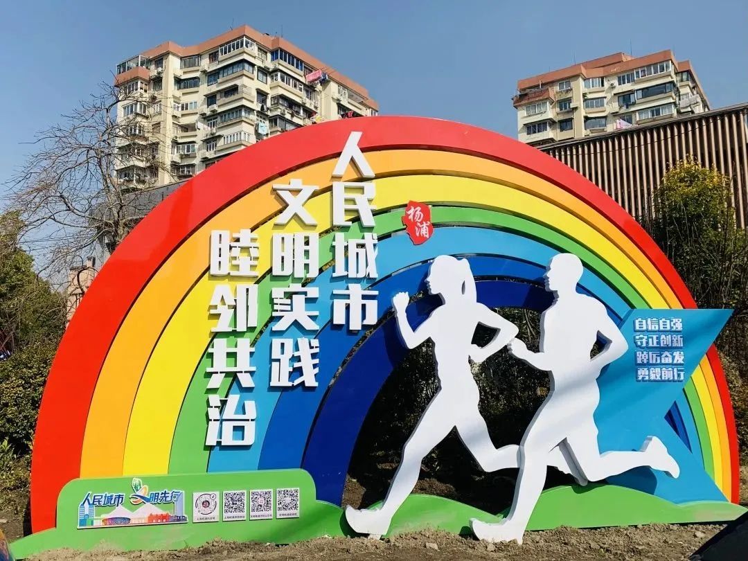 近日,在营口路靖宇东路路口的绿化带内,新增了一处文明标语。彩虹桥下,两位青年相伴慢跑,步伐轻盈,身边写着“人民城市、文明实践、睦邻共治”“自信自强、守正创新、踔厉奋发、勇毅前行”等宣传语,成为杨浦街头一道亮丽的风景,为创建全国文明城区营造了浓厚的氛围。