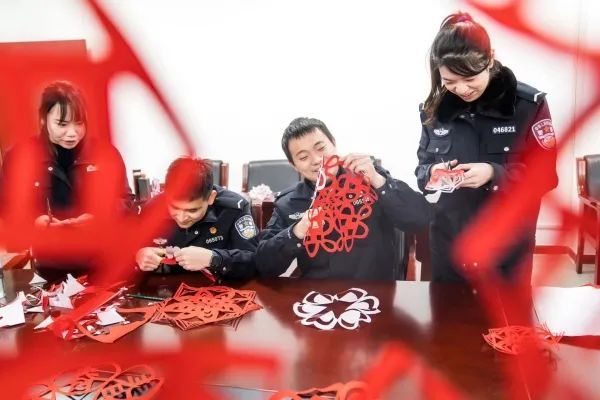 春节值班民警剪窗花布置节日氛围。陆泽昭 摄
