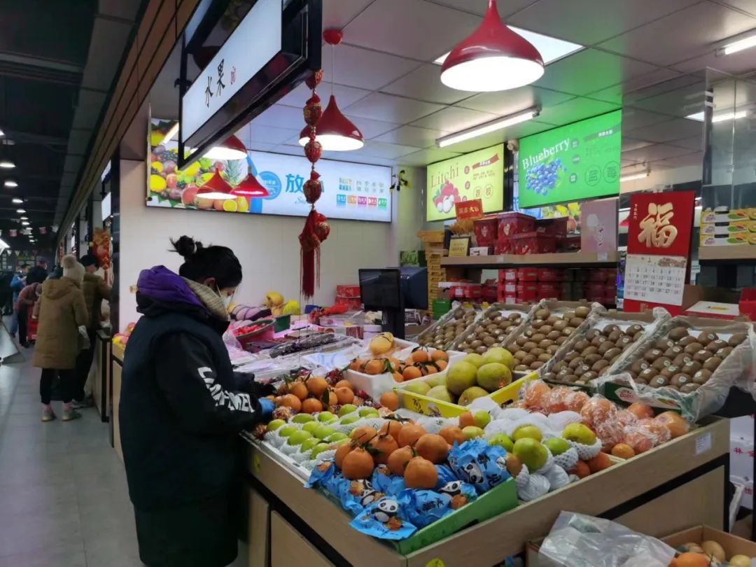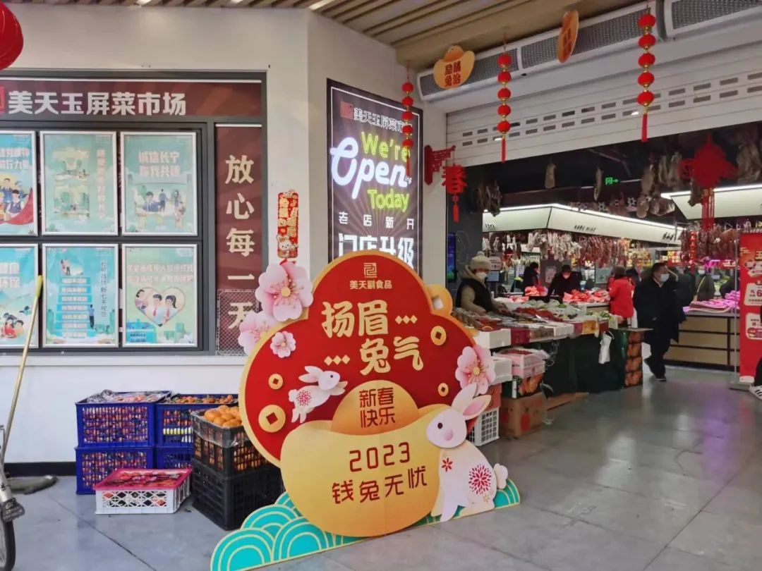 早上8点的长宁美天玉屏菜场内,蔬菜瓜果、肉类水产、南北货、米面粮油等市民日常所需商品,琳琅满目地摆在各个摊位上,品种丰富、货源充足。正逢美天副食品公司的新春活动期间,已选购好商品的市民纷纷拿着收银条前来领取礼品,菜场一片繁忙热闹的景象。