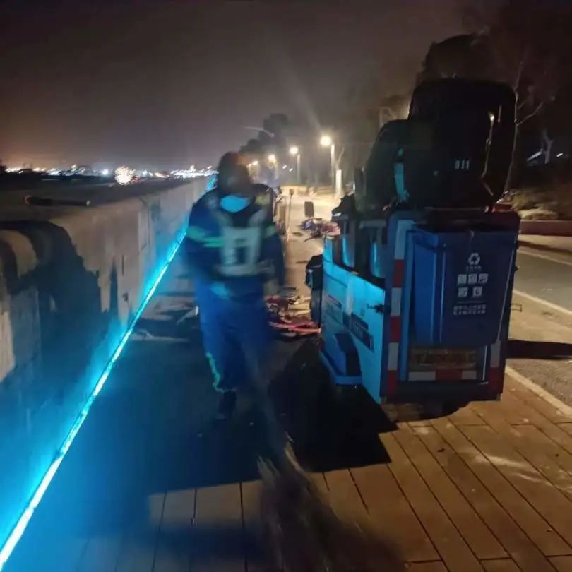 在宝山区友谊路街道的滨江步道,绚烂的烟花此起彼伏,为美好的夜色平添了一份年味,然而这美好的夜晚也是环卫工人最忙碌的一天。为营造整洁、有序、优美、和谐的城市环境,他们始终坚守在自己的岗位上,守护着这座文明之城。
