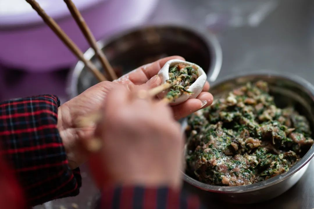 “裹”圆团的第一步是和面,糯米粉和水按比例混合,象征着和和美美之意,和好的糯米面团分成一个个小剂子,再将小剂子揉捏成小碗状加入提前准备好的馅料,一手按馅,一手虎口收紧,搓圆成型即可。