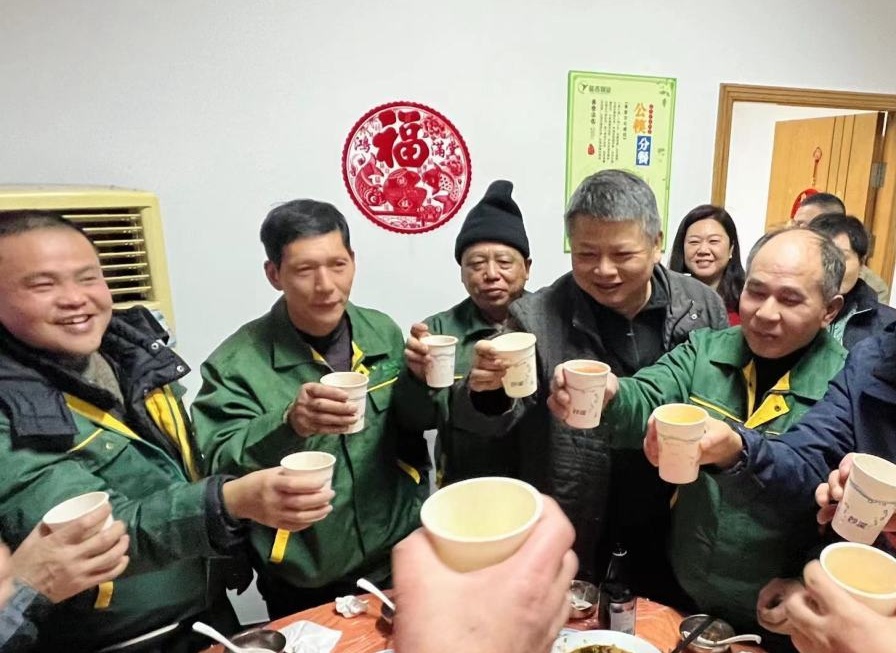 2023年1月21日除夕夜,寒气逼人,但延吉物业公司内温暖如春,喜气洋洋。延吉物业董事长、总经理周强率领班子成员与几十名春节仍然坚守岗位的员工一起共享丰盛的年夜饭,并送上新春祝福,把春节关怀落到实处。