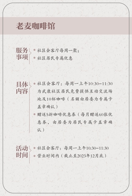非常荣幸成为‘武康汇’大家庭的会客厅,老麦咖啡馆希望为街坊邻里提供一个温暖的空间,也感谢街道和居委会为我们搭建这样的平台,让大家可以从相邻到相识,从相处到相亲,祝我们的武康越来越好!