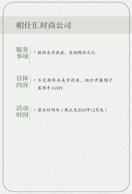 帽仕汇时尚空间,在武康汇自带文艺基因浪漫巨轮的滋养下,已经2岁了。这两年里,感谢社区和街坊邻里的支持,2021年冬,我们也为社区部分老人赠送了保暖帽子,今后,我们将积极参与社区各项活动,与武康社区共成长。