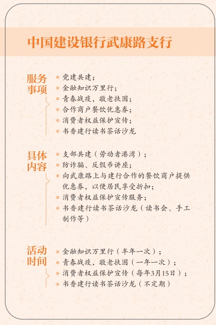 感谢‘武康汇’让武康片区的邻里街坊们相聚在一起,共享资源、共担责任、共同发展、共同繁荣。行善道志,远建合同。建设银行始终秉持智慧服务,以人为本的理念,为更多武康居委的街坊提供更优质的服务。