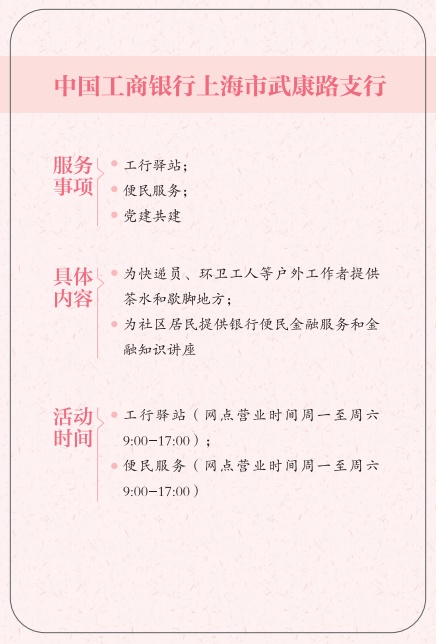 工行武康路支行陪伴武康片区居民已有二十余年时间,我们会继续践行您身边的银行,为武康片区的邻里街坊提供更加优质的,人性化的服务,也会和周边居民,商户一起共建美好的武康社区。