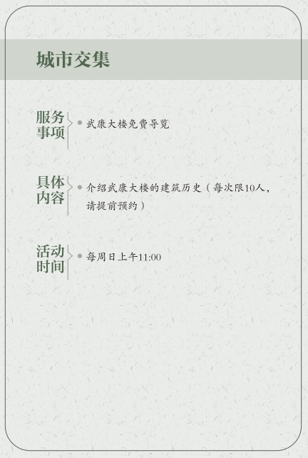 城市交集入驻武康大楼以来举办了许多展现衡复历史文化风貌区内的历史建筑和文化特点的展览、街区行游项目等多样的公共实践活动,希望在武康片区一起搭建一个城市共享的平台,为街坊邻里提供便民服务,共同推动城市文化再生和可持续发展。