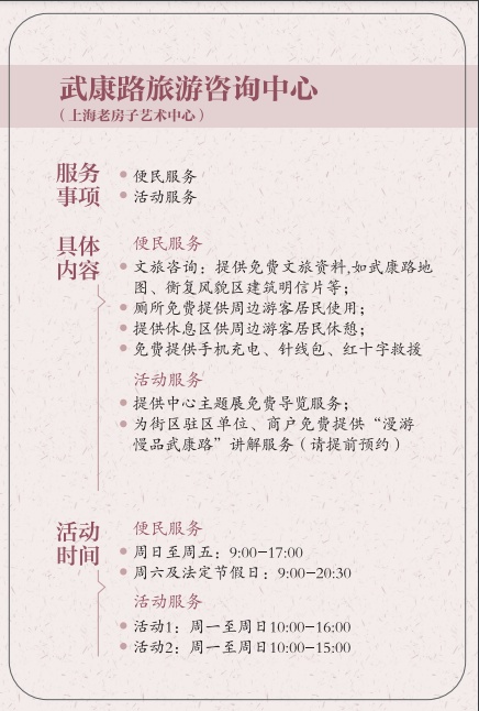 作为政府的文旅服务窗口,中心在武康路已超过十年,一如既往热忱为广大市民、游客们提供便捷、温馨、周到的文旅咨询服务;作为老房子艺术中心,中心通过图片、模型、摄影、展览、讲座等丰富多彩的活动,从不同角度向大家诠释上海、徐汇的老房子历史风貌与文化底蕴。希望能够与居民朋友们一起共建美好的武康社区。