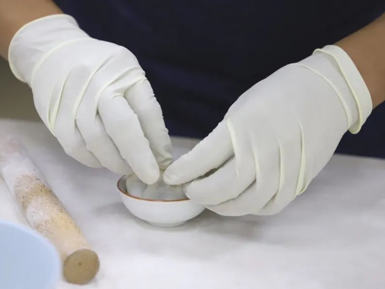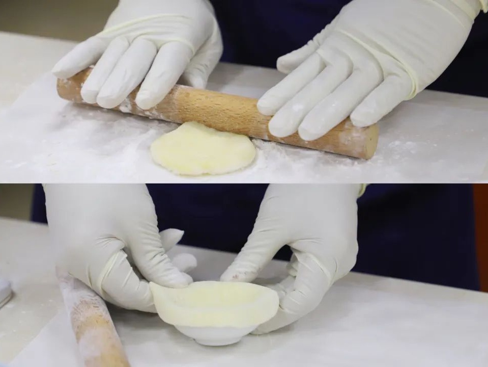 4.将面团从冰箱中取出,依次分成25克重的剂子,擀成糯米皮,放入模具中。