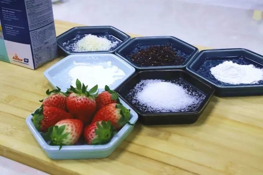 材料:糯米粉70克、玉米淀粉20克、牛奶125克、白砂糖45克、黄油15克、淡奶油125克、紫米100克、椰蓉、草莓若干