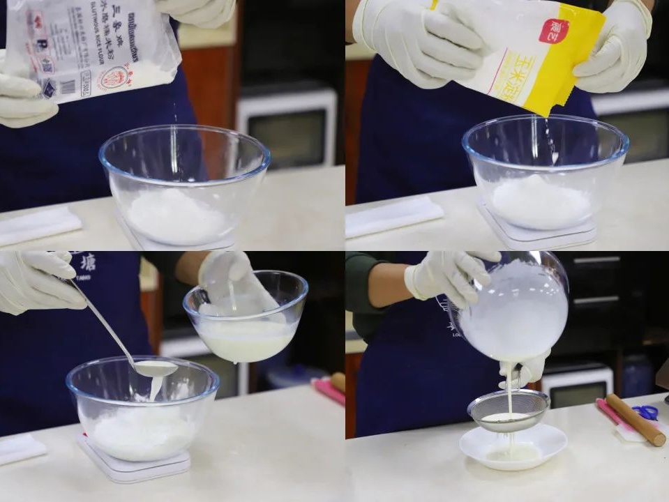2.糯米粉、玉米淀粉、牛奶、白砂糖放入容器,搅拌均匀后过筛。