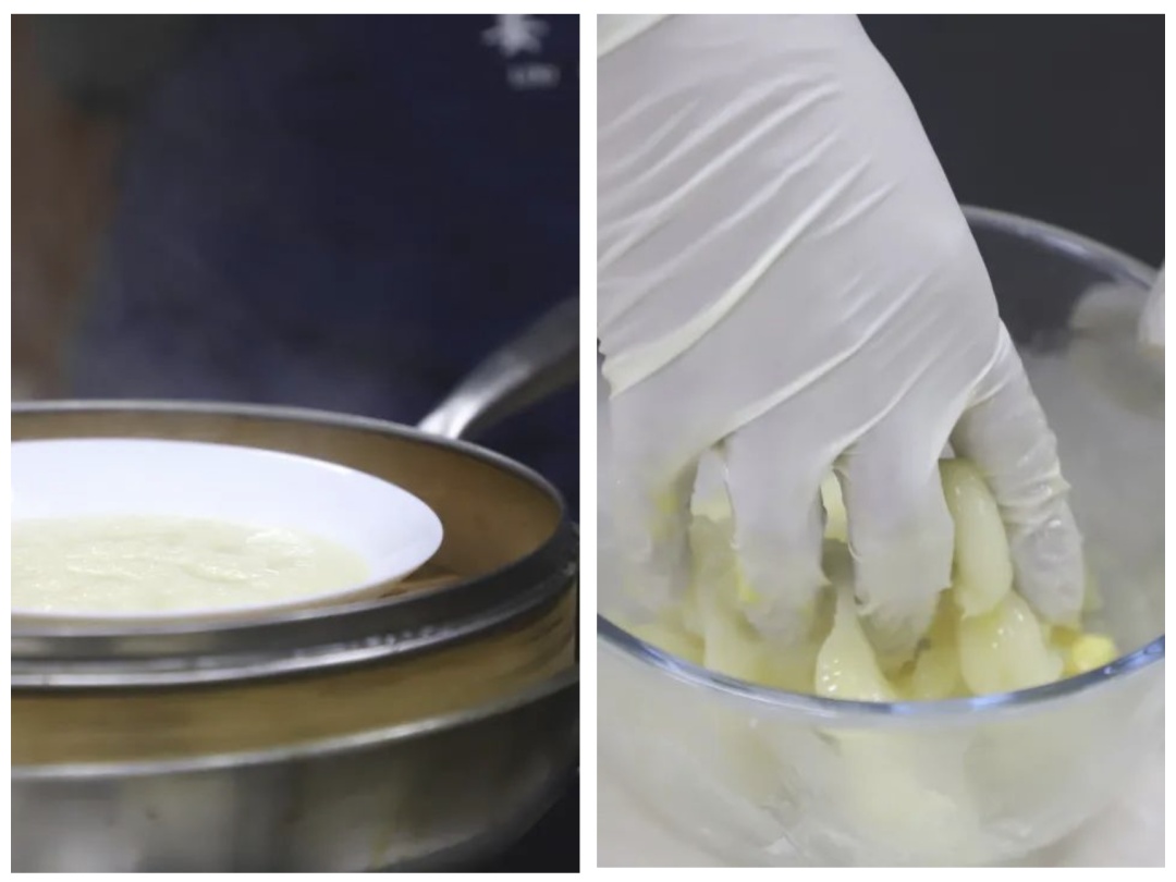 3.过筛后的面糊蒸熟,加入黄油,充分搅拌后放入冰箱冷藏10分钟。