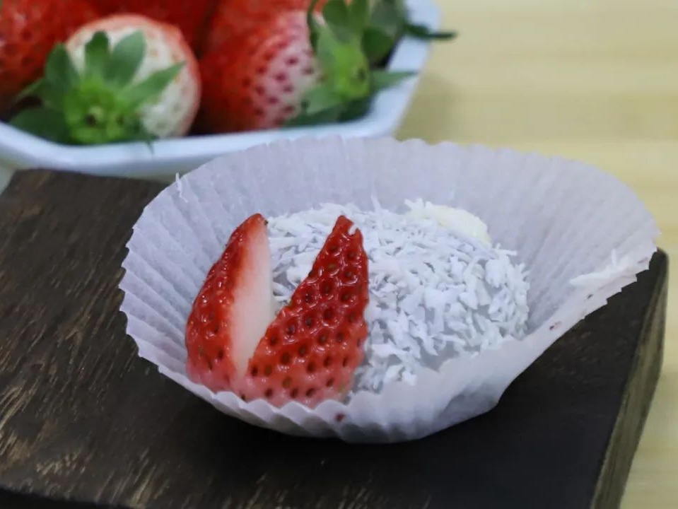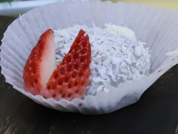 7.用草莓做成兔耳朵的形状,装饰在糍毛团上。