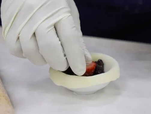 5.在糯米皮中放入蒸熟的紫米以及洗净的草莓。