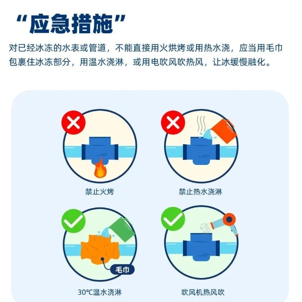 宜用30℃左右的温热水冲淋水表。(切不可用火直接烘烤或用开水急烫,以免造成水管管件开裂)