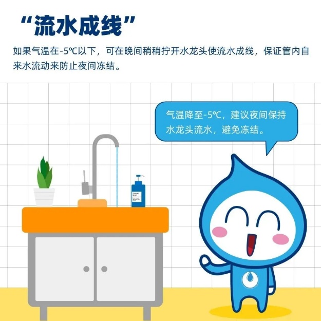 严寒天气里,可在晚间稍稍拧开水龙头滴水成线,保证管内自来水流动,可有效预防管道冻堵,并且滴下的水可以使用合适的容器接着,以节约用水。