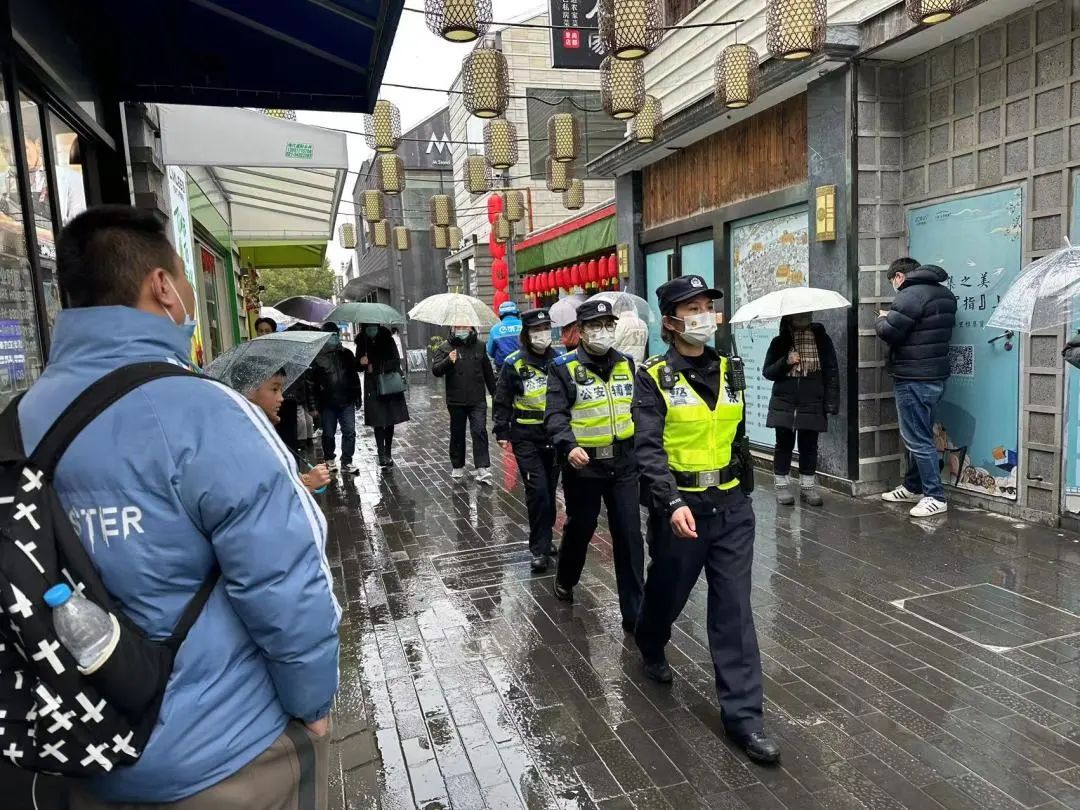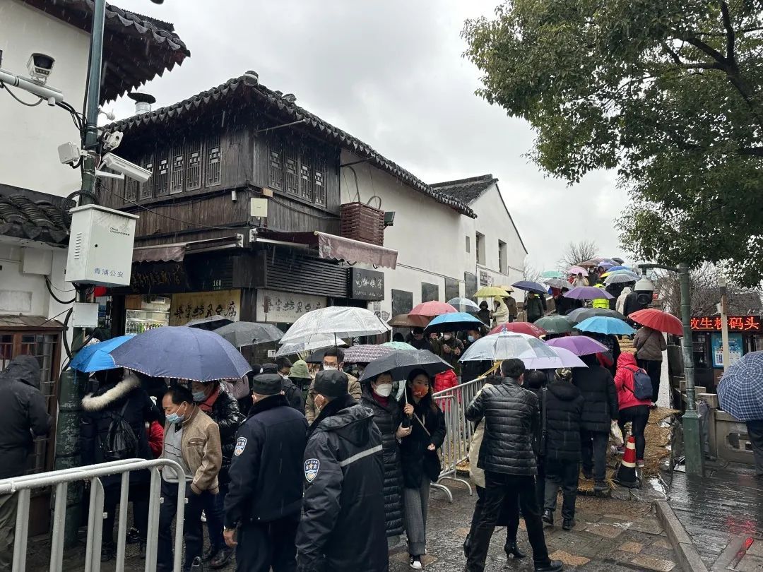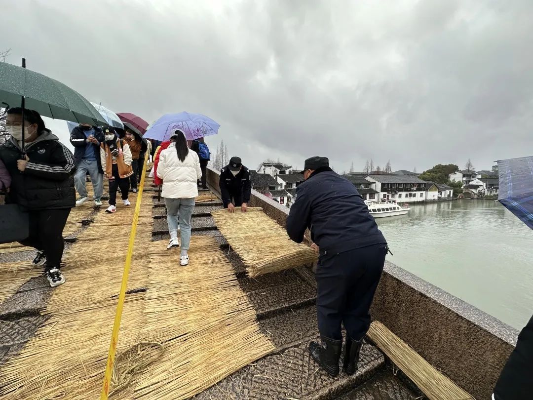 由于客流量较大及雨天路滑,放生桥中间已经拉起了警戒隔离带,并在地上铺起了稻草,防止行人滑倒。为了应对春节期间出现的大客流情况,朱家角派出所女子巡逻队在假日期间,每天都穿梭于古镇的大街小巷之间,她们脚踏青石板小道,走遍古镇每一片土地,亲和地帮助有困难的游客,提醒过往游客注意安全,照看好随行的小孩、老人。