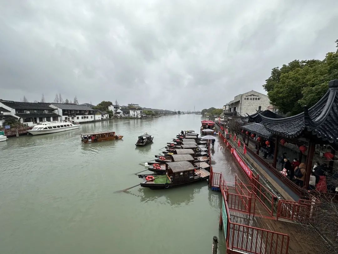 在古镇景区内,一串串大红灯笼等新春装饰挂上古镇景区的街头巷尾,满满的年味扑面而来,处处洋溢着喜庆祥和的节日气氛。无论是新街还是老街上,人气都很旺,大家时不时驻足欣赏,拍拍美照,品尝古镇特色美食,而一旁的游船码头也忙碌不停,不少游客则选择乘乌篷船游览水乡美景。今年11岁的吴同学,今天是和亲朋好友一起来游玩的,他兴奋地告诉记者:“虽然下了一点雨,但我们还是很开心。等走过了放生桥后,一家人还要去坐船,再去品尝一下古镇里的粽子、臭豆腐等特色美食。”
