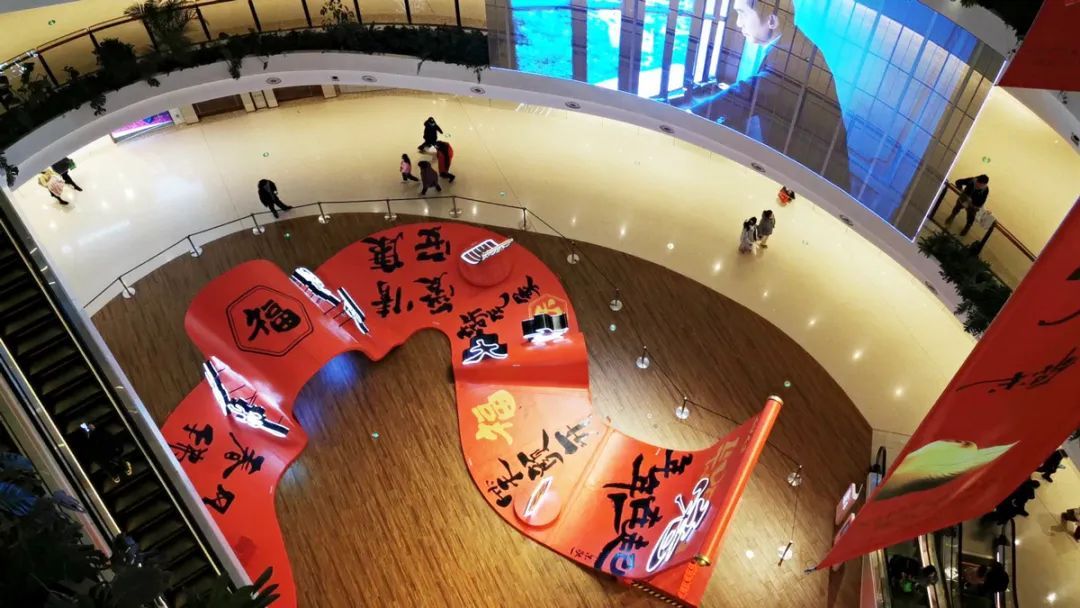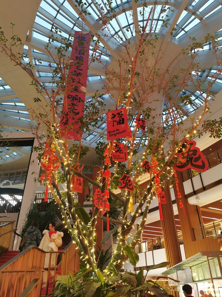 国潮、中国风,要说太阳宫最精彩的装饰,要属年味十足的翰墨书香。在太阳宫5楼一隅,“树”上挂满福字、兔字,灯带与中国红交映,美轮美奂。穹顶上垂挂的巨幅春联更吸人眼球。