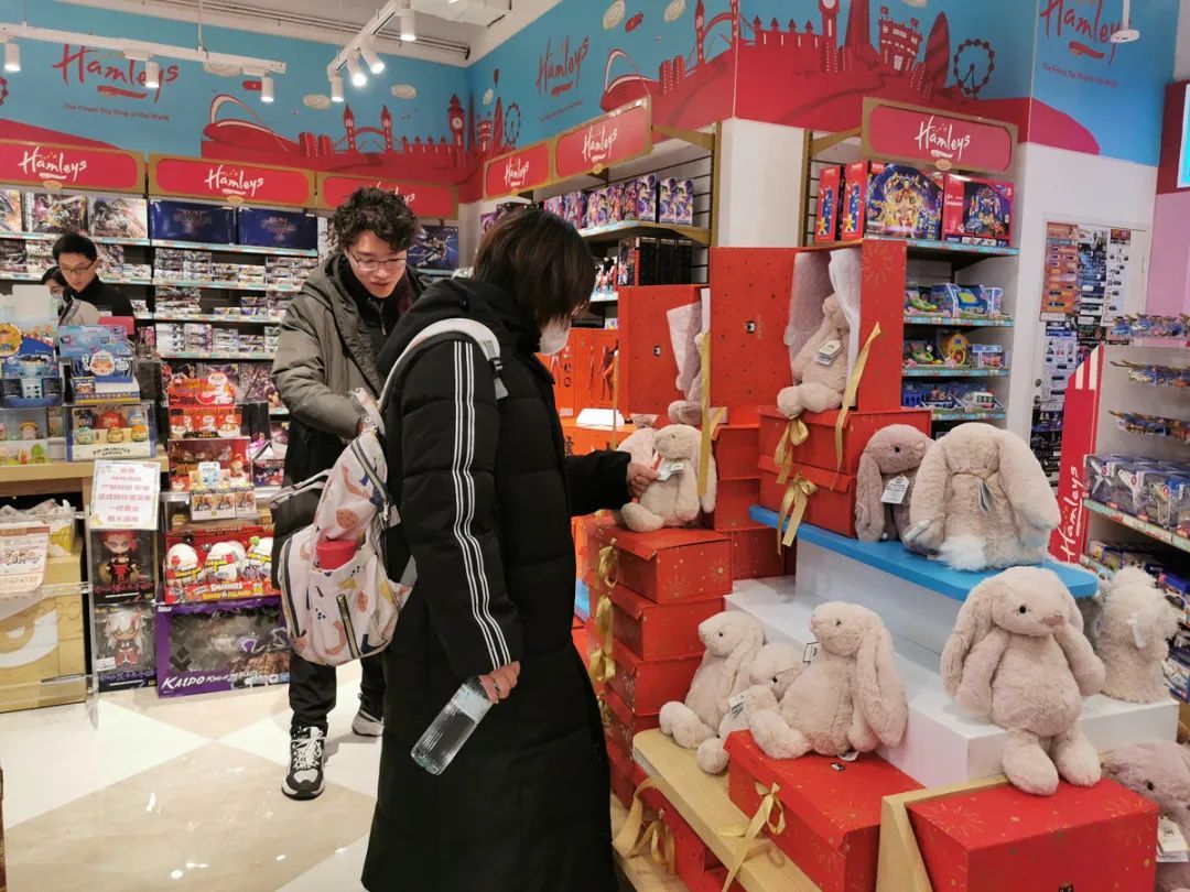 太阳宫一家玩具店内,“大朋友”也对小兔子绒毛玩偶爱不释手。